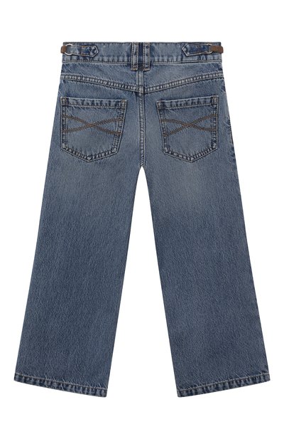 У этих расклешенных джинсов нет задних карманов, а боковые врезные сменились небольшими накладными. Плотный пояс оставили без шлевок и украсили акцентными золотистыми пряжками с рельефным изображением головы горгоны Медузы. Голубая модель с едва заметными потертостями сшита из эластичного хлопка.