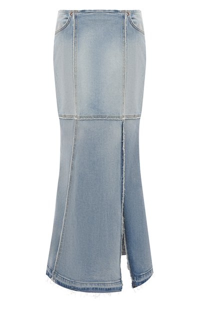 Голубую макси-юбку Column с короткой молнией сзади выполнили из прочного хлопкового денима с добавлением эластичных волокон. Необработанные края сверху создают впечатление, будто пояс отпороли вручную, сделав посадку более низкой. Легкой бахромой подчеркнуты также фактурные швы, низ и высокий разрез слева.