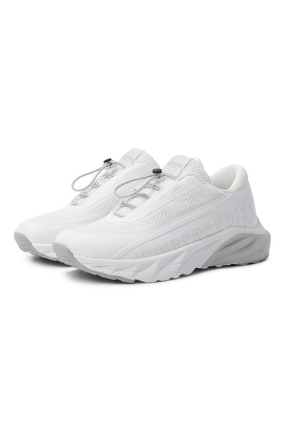 Для изготовления белых кроссовок использовали мягкую эластичную сетку, хорошо пропускающую воздух. Обувь с серебристым узором по бокам укрепили фигурными накладками из прочного текстиля, напоминающего гладкую кожу. Логотип бренда оттенили желтыми вставками. Широкую гибкую подошву дополнили черным протектором, частично заходящим на мыс и задник.