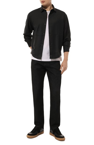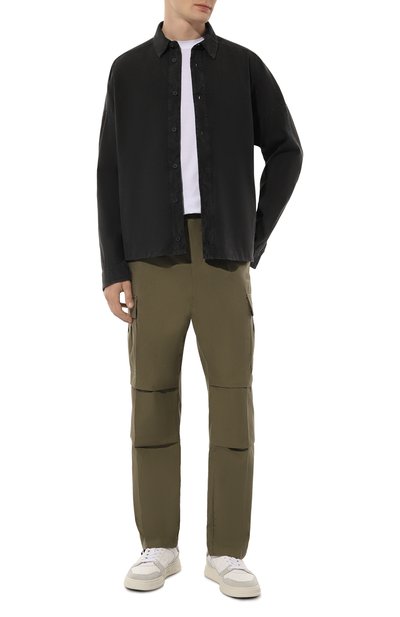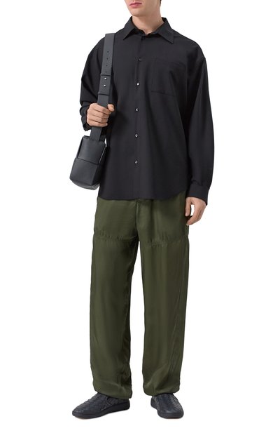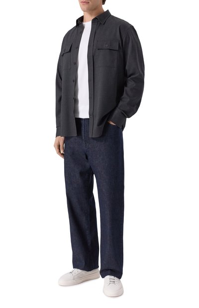 Для изготовления рубашки в едва заметную полоску с узким отложным воротником использовали хлопок с добавлением льна. Утрированно крупный накладной карман делает модель прямого кроя менее формальной и подходящей для непринужденного повседневного образа.