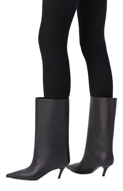 Широкое прямое голенище позволяет сапогам Fiona обходиться без застежки. Высокий каблук обтянули той же бархатистой угольно-черной замшей, которую использовали для пошива самой пары с зауженным мысом. Фактурный материал выделали до особой мягкости и эластичности, поэтому модель получилась не только эффектной, но и комфортной.