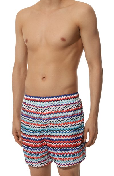 Плавки с характерным зигзагообразным узором сшили из нейлона. Широкий эластичный пояс легко тянется и приятно облегает. Сзади модель дополнили накладным карманом с клапаном. По бокам — еще два прорезных.