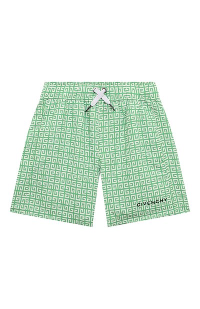 Ярко-зеленые плавки-шорты с паттерном в виде эмблемы 4G сшили из прочного шелковистого полиэстера, который быстро сохнет и безопасен для кожи. Модель с широким эластичным поясом-кулиской, регулирующим посадку на талии, дополнили накладным задним карманом с клапаном на липучке и люверсом для отвода воды. Спереди изделие украсили небольшим черным логотипом.