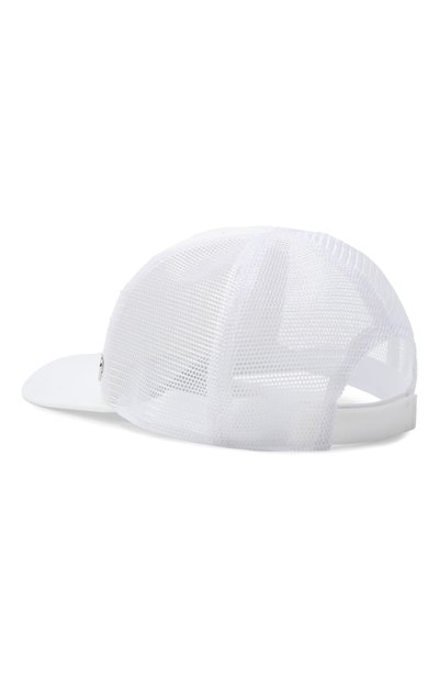 Белую бейсболку со слегка изогнутым широким козырьком выполнили из плотного хлопка. Тулью спереди декорировали крупным цветочным принтом, который подчеркнули отделкой из стразов. Модель д ополнили небольшой серебристой подвеской в виде сердца с логотипом марки.