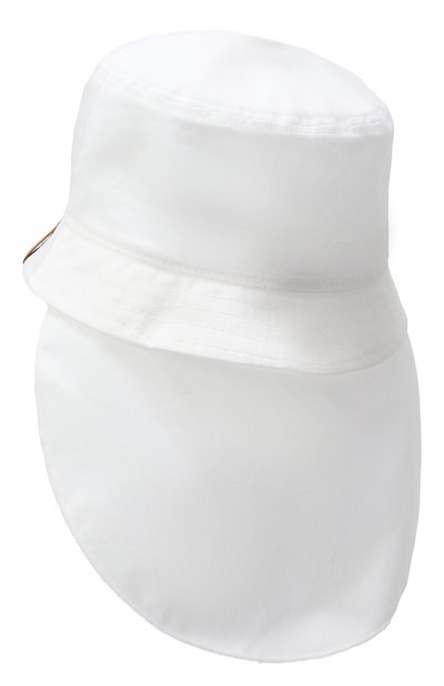 Белая панама с широкими стегаными полями сшита из прочного хлопка с красочными принтами-рыбами. Материал хорошо пропускает воздух, а изделия из него надолго сохраняют заданную форму. Легкий аксессуар дополнен сзади широкой мягкой вставкой, защищающей шею от солнечных лучей.