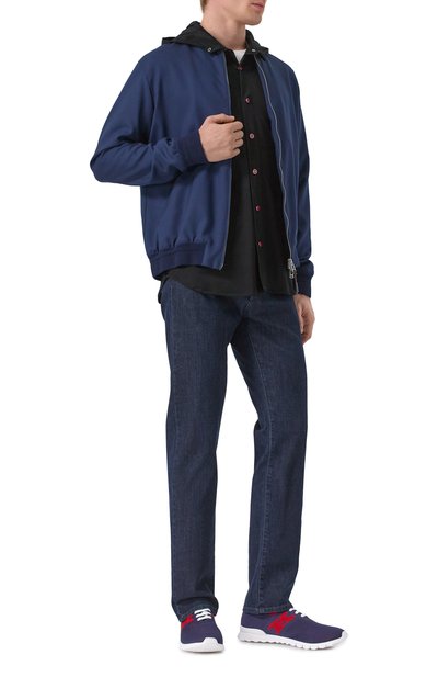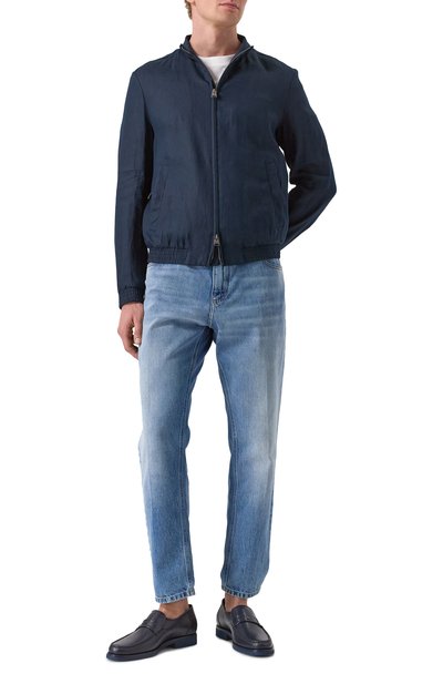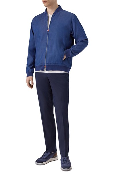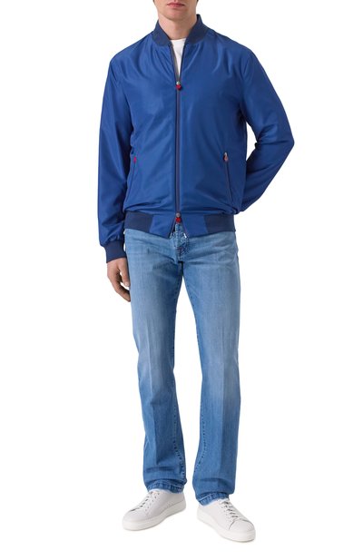 Для пошива синего бомбера с двумя боковыми карманами использовали плотный хлопковый твил. Туго скрученные нити неравномерно впитали краситель, придав материалу меланжевый эффект. Куртка с темными трикотажными воротом, поясом и манжетами застегивается встречной молнией с красными брендиров анными пуллерами.