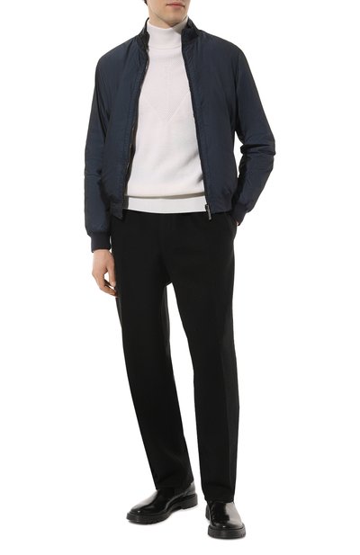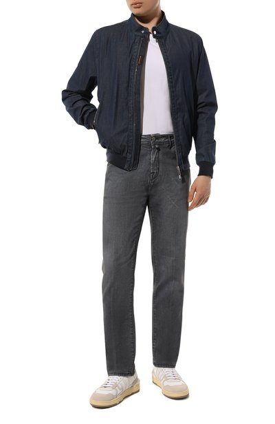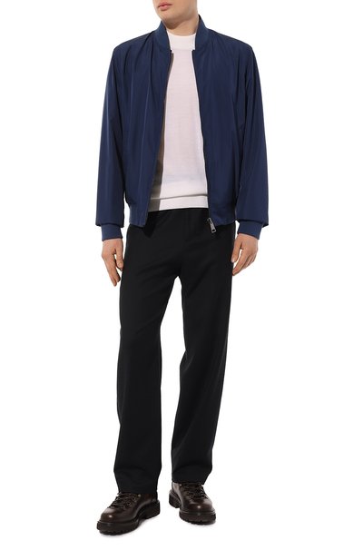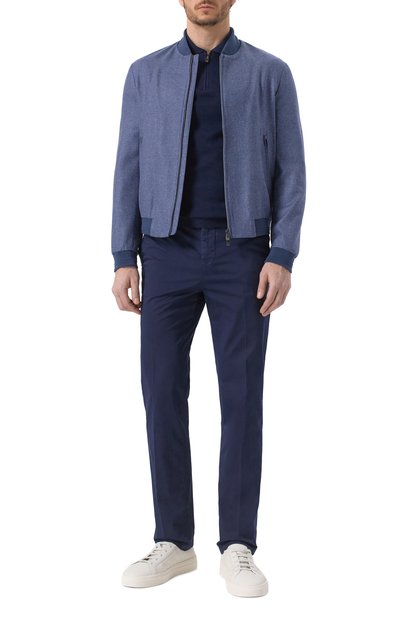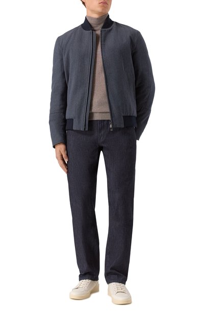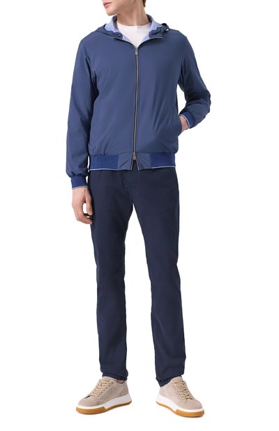 Для пошива синего бомбера с двумя боковыми карманами использовали плотный хлопковый твил. Туго скрученные нити неравномерно впитали краситель, придав материалу меланжевый эффект. Куртка с темными трикотажными воротом, поясом и манжетами застегивается встречной молнией с красными брендированными пуллерами.
