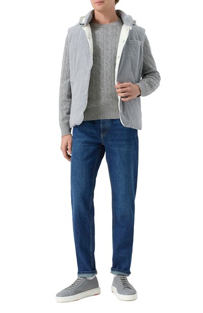 Жемчужно-серый жилет с отстегивающимся регулируемым капюшоном может выступить и в роли промежуточного слоя, и как самостоятельная вещь. Для пошива модели с двумя внутренними карманами и держателем для ручки использовали плотную мягкую шерсть, обеспечивающую защиту от ветра. Стеганые камеры изделия равномерно заполнили отборным гусиным пухом, хорошо сохраняющим тепло.