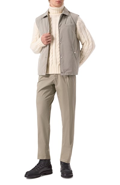 Жемчужно-серый жилет с отстегивающимся регулируемым капюшоном может выступить и в роли промежуточного слоя, и как самостоятельная вещь. Для пошива модели с двумя внутренними карманами и держателем для ручки использовали плотную мягкую шерсть, обеспечивающую защиту от ветра. Стеганые камеры изделия равномерно заполнили отбор ным гусиным пухом, хорошо сохраняющим тепло.