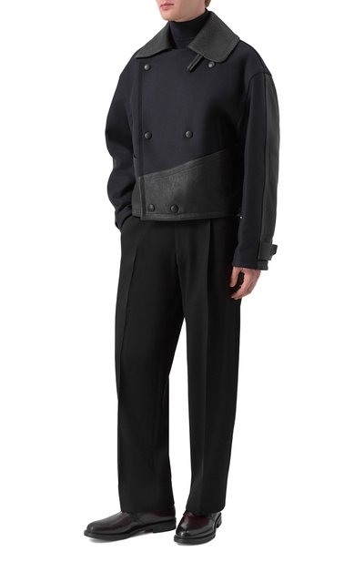Черная косуха с широкими лацканами сшита из мягкой матовой наппы. Благодаря искусной выделке кожа становится особенно легкой и пластичной, поэтому изделия из нее не утяжеляют силуэт и не сковывают движения. Однотонная куртка с тремя внешними и двумя внутренними карманами дополнена по бокам ремешками с пряжками, регулирующими посадку.