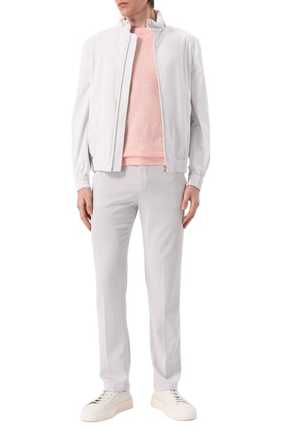 Белый бомбер станет хорошим компаньоном в прохладный день. Для изготовления модели с эластичными манжетами и поясом, удерживающими тепло, использовали мягкий материал на основе вискозы. Полотно укрепили волокнами полиамида. Изделие с двумя прорезными карманами на молниях и небольшим логотипом бренда застегивает ся черными кнопками.