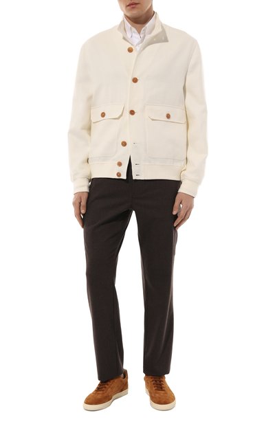 Белый бомбер станет хорошим компаньоном в прохладный день. Для изготовления модели с эластичными манжетами и поясом, удерживающими тепло, использовали мягкий материал на основе вискозы. Полотно укрепили волокнами полиамида. Изделие с двумя прорезными карманами на молниях и небольшим логотипом бренда застегивается черными кнопками.