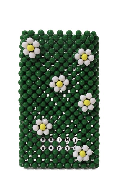 Футляр для iPhone в исполнении итальянских дизайнеров получился по-летнему ярким. Аксессуар с короткой ручкой сплели из глянцевых акриловых бусин цвета зеленой травы. В узор включили детали с черными литерами, из которых составили логотип марки. Поверх панелей закрепили контрастные аппликации-ромашки.