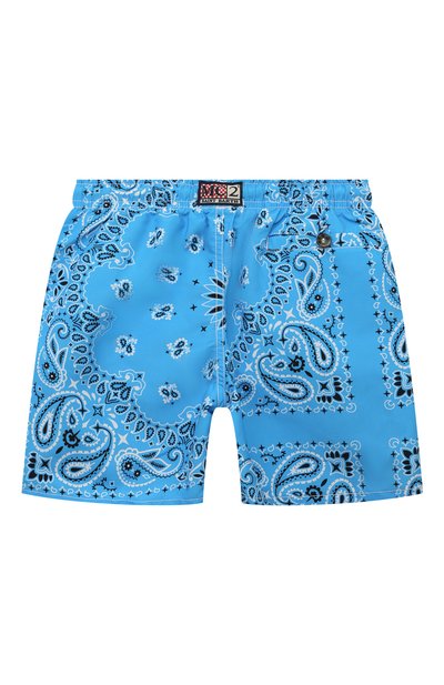 Прямые плавки-шорты из переработанного полиэстера кажутся неоновыми благодаря максимально яркому голубому оттенку. Его слегка приглушили черно-белым узором пейсли, подсмотренным у бандан. Шнур в эластичном поясе-кулиске акцентировали красной полоской, которая гармонирует с фирменным патчем сзади. Модель с тремя карманами дополнили сетчатым подкладом.