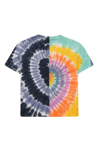 Разноцветную футболку с сиреневым принтом в виде пальм и логотипа спереди окрасили в технике тай-дай. Для пошива модели, присборенной под V-образным вырезом использовали тонкое эластичное джерси из отборного хлопка: такой мягкий дышащий материал обеспечивает комфорт даже в жаркую погоду.