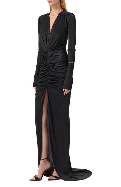 Платье Rosalia с горизонтальной драпировкой спереди выполнили из джерси стрейч. Короткую облегающую модель визуально удлинили бахромой по краю подола. Изделие дополнили бретелями, завязывающимися на шее.