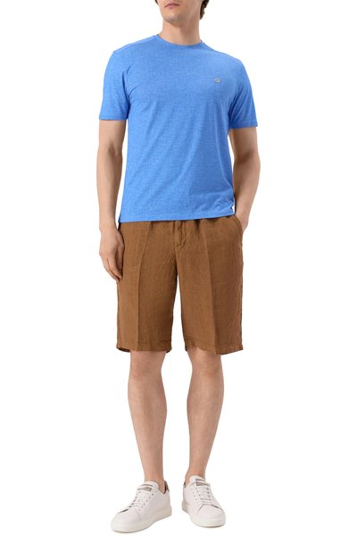 Синяя футболка с меланжевым эффектом справится с многозадачностью в гардеробе и впишется в образ разной степени сложности. Модель выполнили в 22 этапа, половина из которых — ручная работа. Для пошива использовали особенно мягкое на ощупь джерси из шелка и длинноволокнистого хлопка. Изделие почти не ощуща ется на теле и поддерживает комфортный микроклимат.