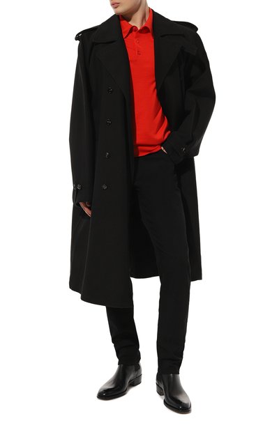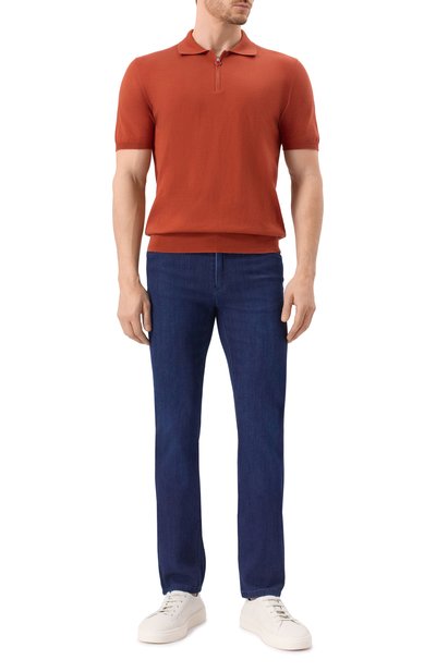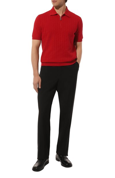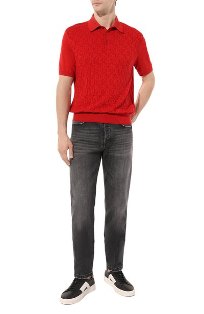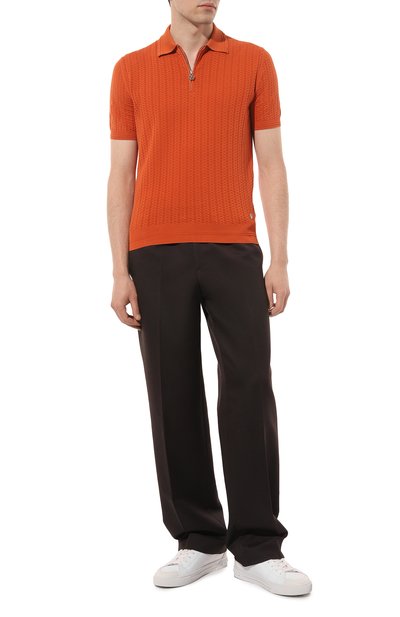 Поло с рифленым полосатым узором спереди изготовили из тонкого шелкового трикотажа. Изделие застегивается короткой молнией с брендированным пуллером.