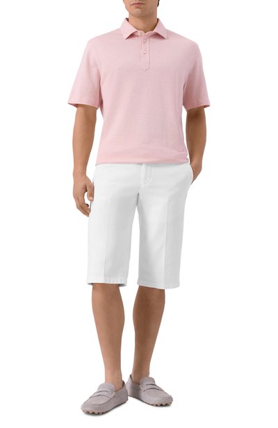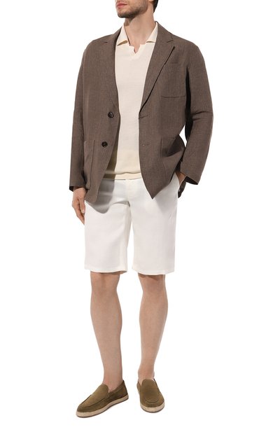 Дизайн белых шортов в меловую полоску вдохновлен функциональной формой теннисистов. Комфорт спортивной одежды воплотили в прямом крое с защипами, эластичном поясе и почти невесомом полиэстере, который отлично тянется. Чтобы бермуды приятно ощ ущались на теле, их дополнили подкладом из мягкого хлопкового джерси. Модель с врезными боковыми и задними карманами украсили патчем с изображением ракетки и логотипом марки, основанной Брунелло Кучинелли.