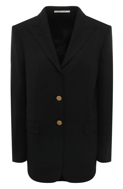 Черный жакет в стиле power dressing благодаря плотным внутренним вставкам формирует четкую линию плеч. Еще строже модель делают слегка приталенный крой и гладкий черный твил на основе отборной шерсти. Полиэстер в составе ткани сделал модель с высокой шлицей немнущейся, а эластан гарантировал свободу движений. Изделие с тремя карманами дополнили шелковистым подкладом, поэтому его комфортно носить на голое тело.