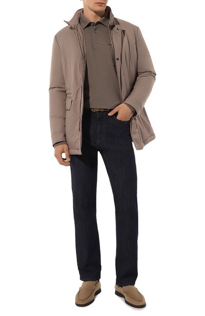 Бежевая куртка позволит выглядеть элегантно даже в непогоду. Для пошива модели с отложным воротником и крупными накладными карманами с клапанами использовали тонкую шерстяную ткань с шевронным узором. В непродуваемый материал, сохраняющий оптимальный микроклимат, добавили тонкий шелк для прочности. Изделие с высокой шлицей сзади застегивается молнией, скрытой под штормовой планкой.