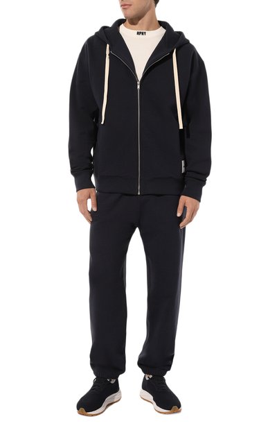 Темно-синяя толстовка сможет заменить куртку прохладным летним вечером или послужит дополнительным слоем в межсезонье. Для изготовления модели с регулируемым капюшоном использовали плотный хлопковый трикотаж, поддерживающий оптимальный микроклимат. Изделие, как и два боковых кармана, застегивается встречной молнией.