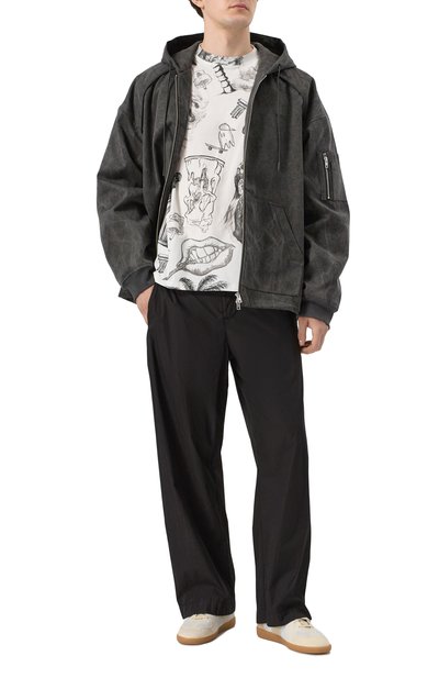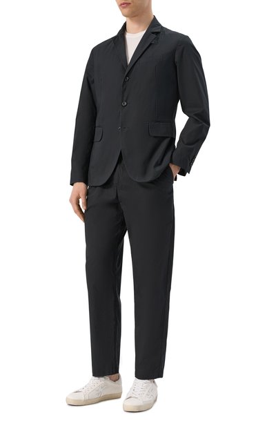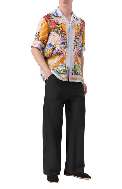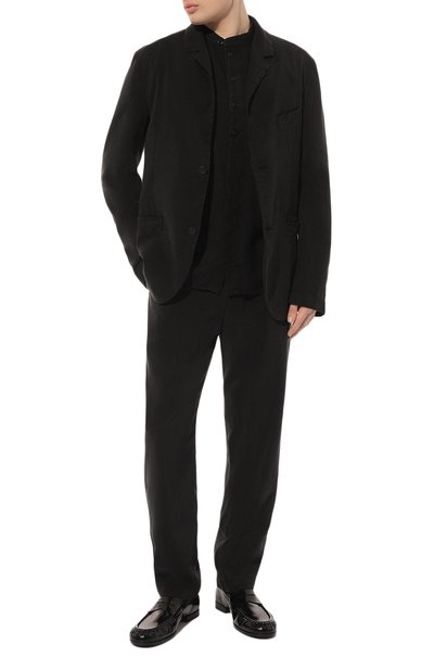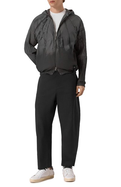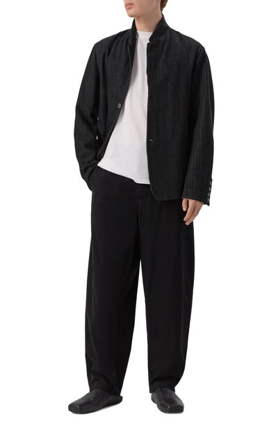 Брюки с высокой посадкой и защипами сшиты из легкого хлопка. Однотонная модель без декора дополнена поясом-кулиской и двумя парами врезных карманов.
