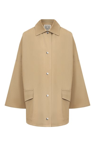 Для пошива расклешенной куртки использовали саржу средней плотности из органического хлопка. Модель с заниженной линией плеча и широкими рукавами дополнена накладными карманами с клапанами. Изделие застегивается кнопками.