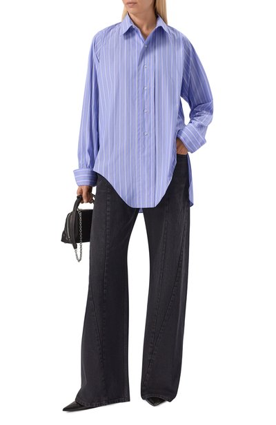 Дрис ван Нотен выбрал для пошива голубой свободной рубашки тонкий хлопковый поплин в белую полоску. На длинных рукавах со спущенной линией плеч этот графичный мотив расположили по диагонали, а на кокетке сзади — по горизонтали, придав модели асимметрии. Изделие с отложным воротником идеально сочетается и с классическими брюками, и с потертыми джинсами.