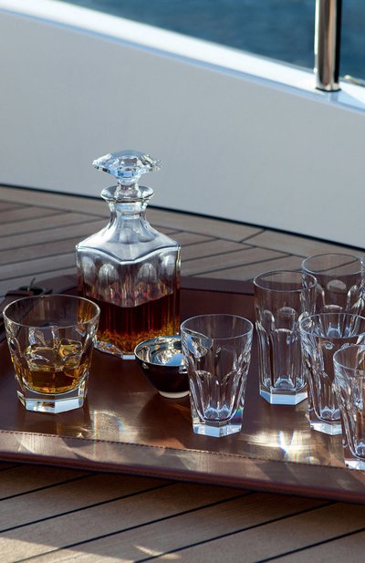Дно прозрачных стеклянных стаканов декорировали двусторонним черно-белым узором с изображением Лины Кавальери — знаменитой оперной певицы, которой Пьеро Форназетти посвятил сотни своих творений. От изделия к изделию выражение лица красавицы меняется. Набор станет приятным подарком для коллекционеров изделий из культовой серии Tema e Variazioni.