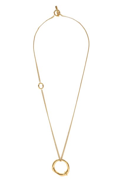 Крупный асимметричный кулон-кольцо и тонкая цепочка панцирного плетения изготовлены вручную из гипоаллергенного ювелирного сплава, покрытого тонким слоем золота. Длина легкого украшения с небольшой застежкой-тоглом регулируется при помощи дополнительного звена.