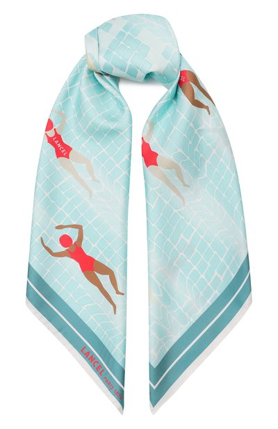 Бирюзовый квадратный платок с принтом в виде спортивного бассейна и пловцов сшили из легкого шелкового твила. Его характерный глянцевый блеск и струящаяся фактура сделали изображение водной глади реалистичной. Аксессуар с двойным однотонным кантом добавит акцент лаконичному платью или станет декором любимой сумки.