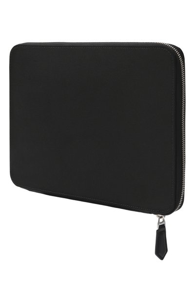 Минималистичный черный чехол для iPad с диагональю 12.9 дюймов выполнили из мягкой зернистой кожи с деликатным блеском. Внутри аксессуара, застегивающегося молнией, предусмотрен закрытый карман. Принадлежность бренду обозначили небольшим металлическим логотипом в углу.