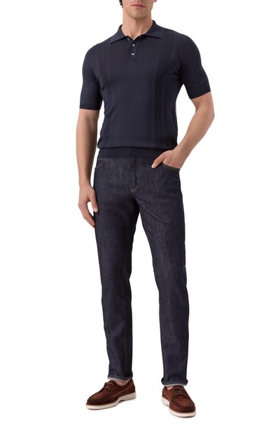 Темно-синее поло поможет составить образ в стиле smart casual, если надеть его с брюками, пиджаком и пенни-лоферами. Прямую модель изготовили из мягкого трикотажа с геометрическим паттерном, в котором зашифровали литеру Z. Сырьем для не подверженного пилингу материала выбрали длинноволокнистый хлопок и прочный, немного блестящий шелк.