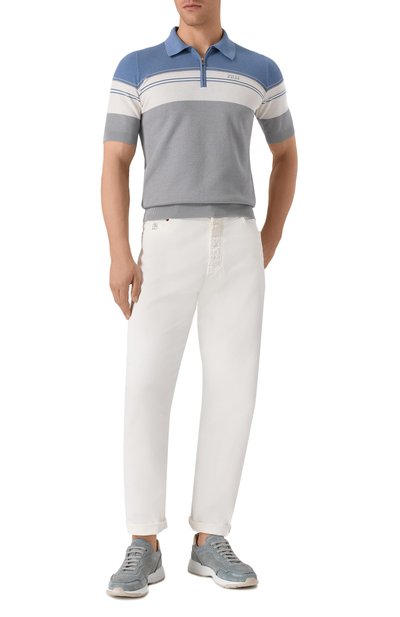 Для изготовления этого поло с короткой молнией и фирменным пуллером использовали приятный на ощупь трикотаж, в составе которого поровну соединили длинноволокнистый хлопок и ценный шелк. Рукава и переднюю полочку выполнили из материала с орнаментом цвета хаки, а спинку оставили белой однотонной. Ее зарифмовали с манжетами и поясом.