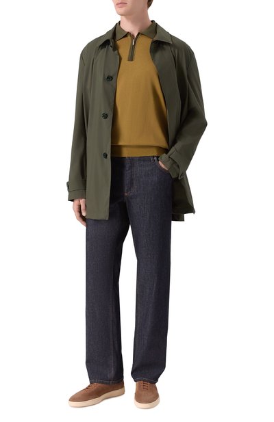 Лаконичное поло оттенка хаки поддержит как непринужденные, так и более сдержанные повседневные образы. Модель выполнили из мягкого гладкого трикотажа на основе дышащего хлопка и прочного шелка, поэтому она хорошо пропускает воздух и не теряет опрятный вид со временем. Пуговицы заменили короткой молнией, под черкнутой кантом в тон отложному воротнику.