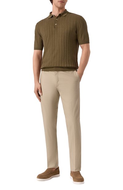 Лаконичное поло оттенка хаки поддержит как непринужденные, так и более сдержанные повседневные образы. Модель выполнили из мягкого гладкого трикотажа на основе дышащего хлопка и прочного шелка, поэтому она хорошо пропускает воздух и не теряет опрятный вид со временем. Пуговицы заменили короткой молнией, подчеркнуто й кантом в тон отложному воротнику.