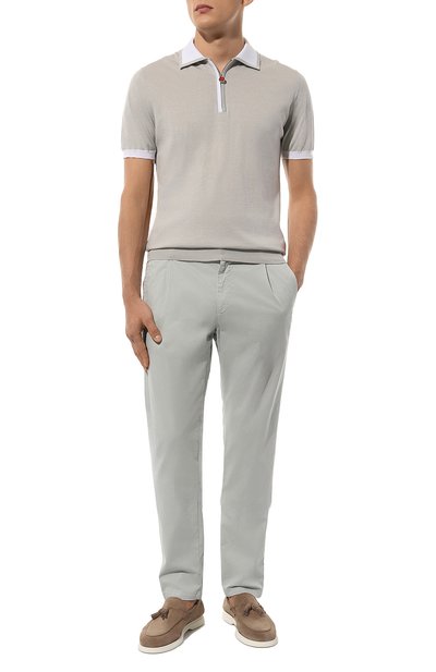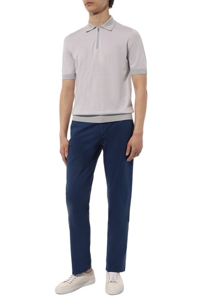 Серое поло станет подружится и с потертыми джинсами, и со строгими брюками. Модель получилась особенно приятной на ощупь за счет тонкого трикотажа из отборного тщательно очищенного хлопка и прочного шелка. Изделие украсили небольшим логотипом сзади, зарифмованным с узором в полоску на отложном воротнике и планке короткой молнии.