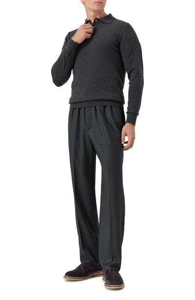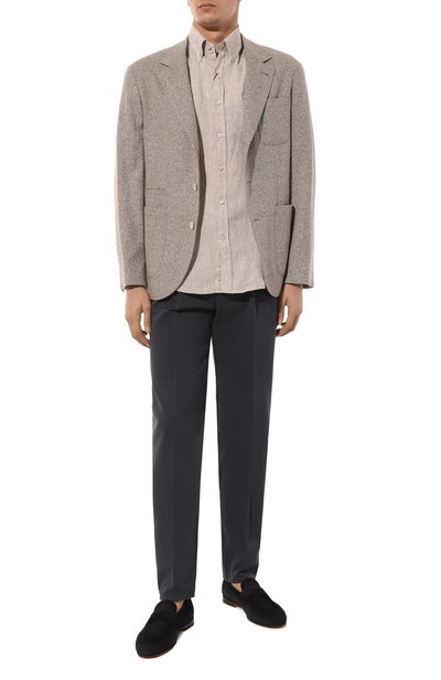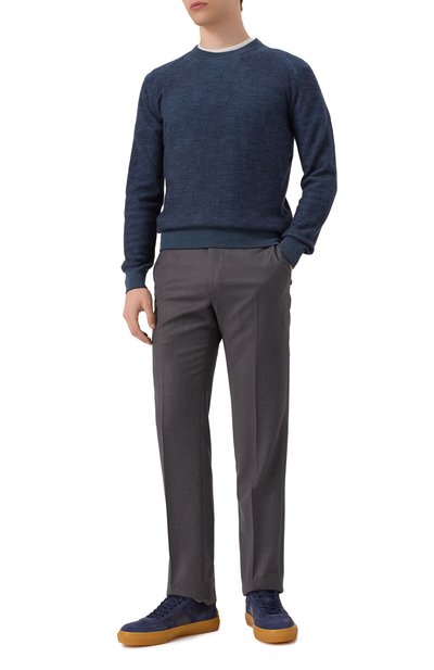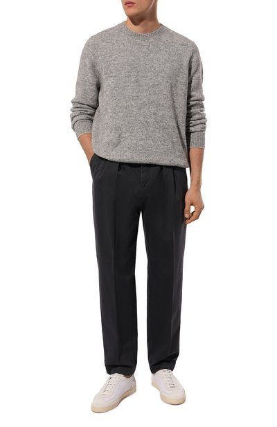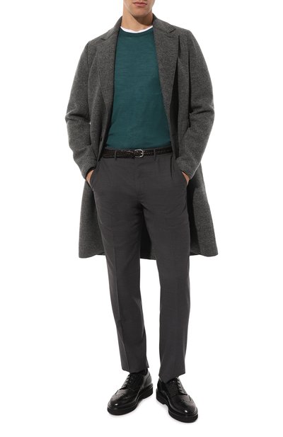 Прямые брюки со стрелками и двойными защипами выполнили из хлопка. Модель с двумя боковыми и парой задних карманов дополнили съемным поясом.