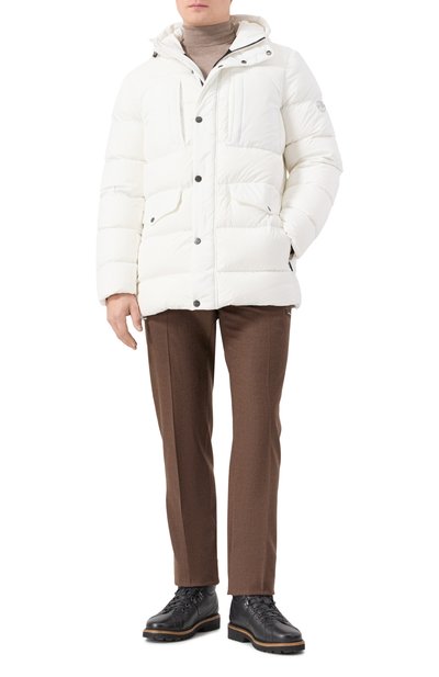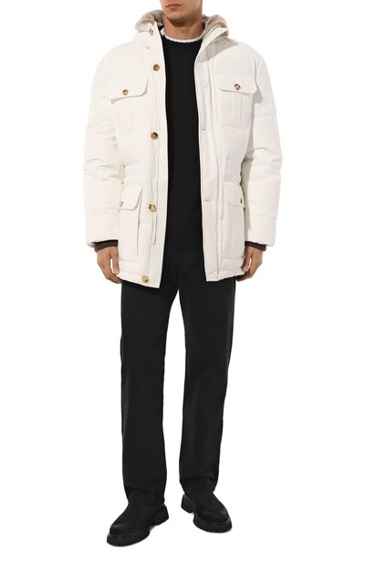 Кремовый пуховик сшили из мягкой кашемировой ткани с небольшим добавлением шелковистой шерсти. Этот почти невесомый материал сам по себе хорошо согревает, а еще комфортнее модель делает наполнитель из отборного утиного пуха. Куртку с отложным воротником из приятного на ощупь меха, одним внутренним и двумя внешними карманами на молниях дополнили штормовой планкой, эластичными манжетами и съемным капюшоном.