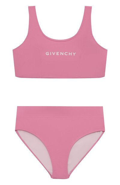 Для пошива розового раздельного купальника использовали тонкую шелковистую микрофибру, которая не раздражает чувствительную кожу ребенка, быстро сохнет и хорошо тянется. Топ с широкими бретелями декорировали белым логотипом, плавки с завышенной посадкой — знаковой эмблемой 4G на плоском поясе сзади.