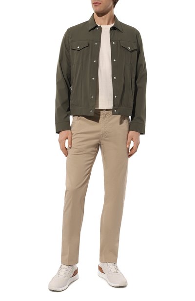 Главным декоративным элементом брюк универсального бежевого цвета стали карманы карго, застегивающиеся молниями с широкими лентами-пуллерами. Для пошива модели с завышенной посадкой и кокеткой сзади использовали фактурный хлопок. Плотный материал почти не мнется, поэтому изделие долго выглядит идеально.
