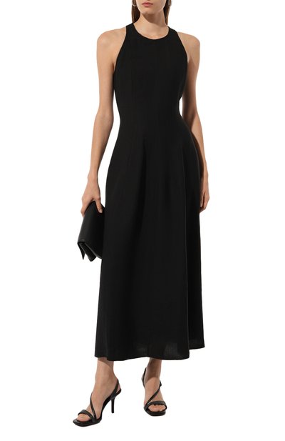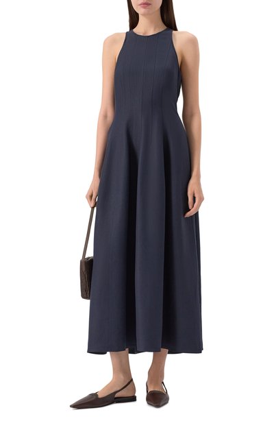 Вертикальные швы на синем джинсовом миди-платье формируют отточенный силуэт, подсмотренный у корсета. С бежевыми строчками гармонирует цепочка мониль бронзового оттенка, обрамляющая круглый вырез и проймы. Слегка блестит не только декор, но и облегченный деним Wet-Effect из длинноволокнистого хлопка. Мастера марки, основанной Брунелло Кучинелли, ламинировали ткань, чтобы создать иллюзию влажного материала. Сзади — потайная молния.