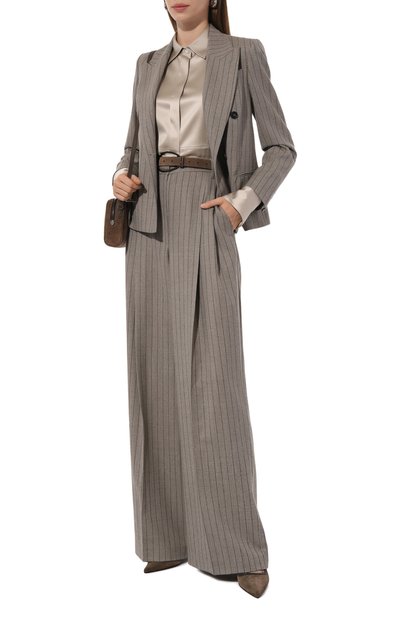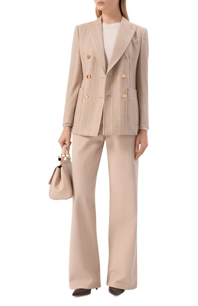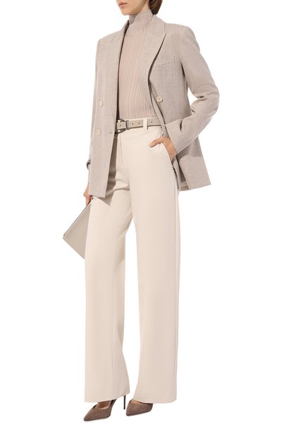 Бежевый двубортный жакет выполнили из мягкой вискозной ткани с добавлением тщательно очищенного льна, длинные волокна которого обладает терморегулирующими свойствами. Слегка приталенный крой приятной на ощупь модели с заостренными лацканами отвечает за посадку и свободу движения. Сзади изделие украсили знаковой для марки, основанной Брунелло Кучинелли, тонкой цепочкой мониль.