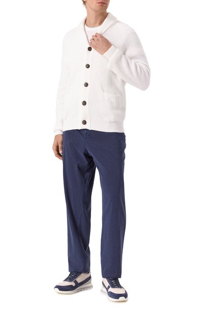 Кардиган с рукавами реглан и шалевым воротником связали из фасонной хлопковой пряжи malfilé, придающей английской резинке слегка неравномерную текстуру. Модель с накладными карманами застегивается крупными золотистыми пуговицами с рельефным логотипом.