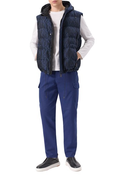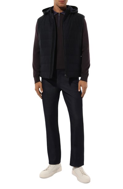 Темно-серый жилет сшили из комбинации плотного полушерстяного габардина и гладкого нейлона с шелковистым блеском. За дополнительную защиту от дождя и ветра отвечает глубокий капюшон, украшенный брендированной нашивкой из кожи ягненка. Из нее же выполнили отделку встречной молнии. Модель дополнили четырьмя внешними и внутренним карманами.
