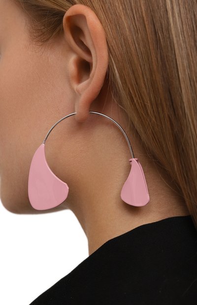 Розовые серьги скульптурной формы, которую словно позаимствовали у экспонатов музея современного искусства, выполнили из легкой латуни с гальваническим покрытием серебром. Две крупные подвески с плавными неровными контурами окрасили глянцевой эмалью нежного розового цвета. Застежку-петлю сделали утрированно длинной, поэтому украшение не потеряется.