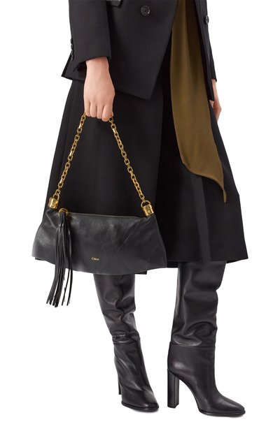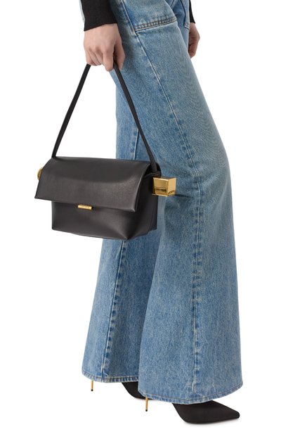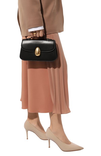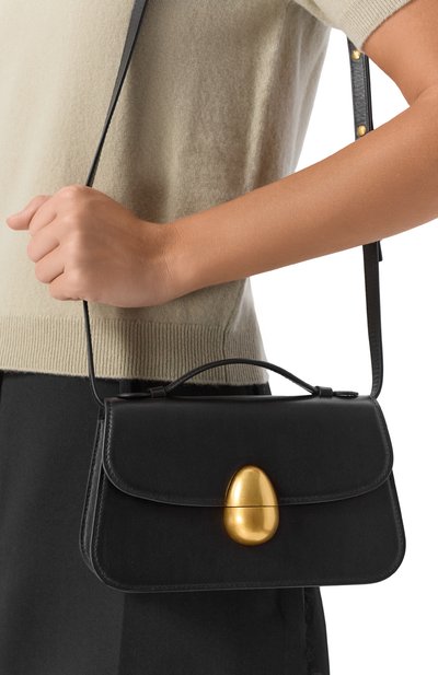 Для изготовления черной сумки Phoenix использовали прочную телячью кожу, сертифицированную по стандартам LWG. Сдержанный дизайн прямоугольного аксессуара компенсировали знаковым замком в виде объемного золотого яйца на откидном клапане и фигурной съемной ручкой, длины которой хватит, чтобы носить модель на плече. В два отделения поместятся картхолдер, смартфон, очки и ключи.