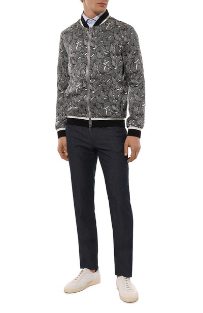 Бомбер с двумя врезными карманами, дополненный воротником, поясом и манжетами из эластичного трикотажа, сшит из гладкого прочного шелка цвета хаки. Материал с трехмерным принтом, в котором угадываются логотипы марки, обеспечивает оптимальную терморегуляцию, а подклад из гладкого купро отлично пропускает воздух.