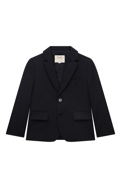 Двубортный темно-синий пиджак выполнили из шерсти с добавлением эластана. Для подклада использовали ше лковистый материал на основе вискозы. Модель прямого кроя застегивается двумя крупными пуговицами. Спереди — два боковых кармана с клапанами и имитация нагрудного.